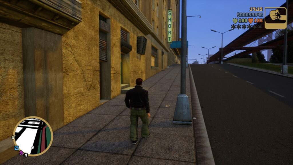 GTA III のグラフィックは、リメイク版とはいえ 2001 年生まれのゲーム。モデリングも描き込みも控えめで、ビルの窓も道路の割れ目も、どこか「情報が抜け落ちたような質感」に仕上がっている。