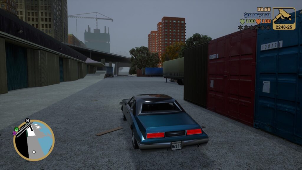『Grand Theft Auto III – The Definitive Edition』より:人影のない倉庫エリア。コンテナの脇に車を停め、ただカーラジオの音に身を委ねる。© Rockstar Games
