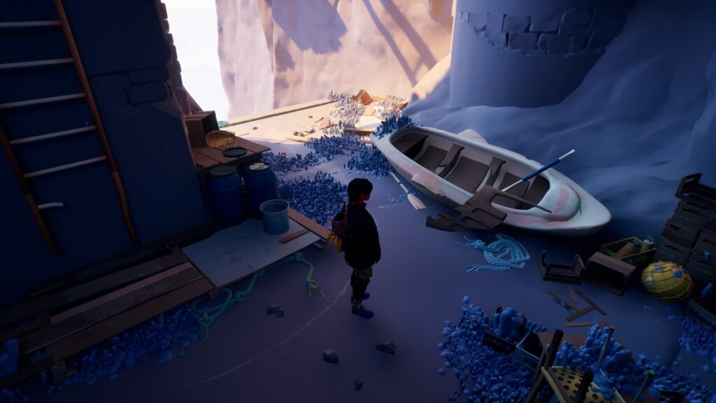 『Jusant』より:高地に残された舟や漁具。そこにあるはずのないものが、世界の変貌を物語る。 © DON’T NOD / Focus Entertainment