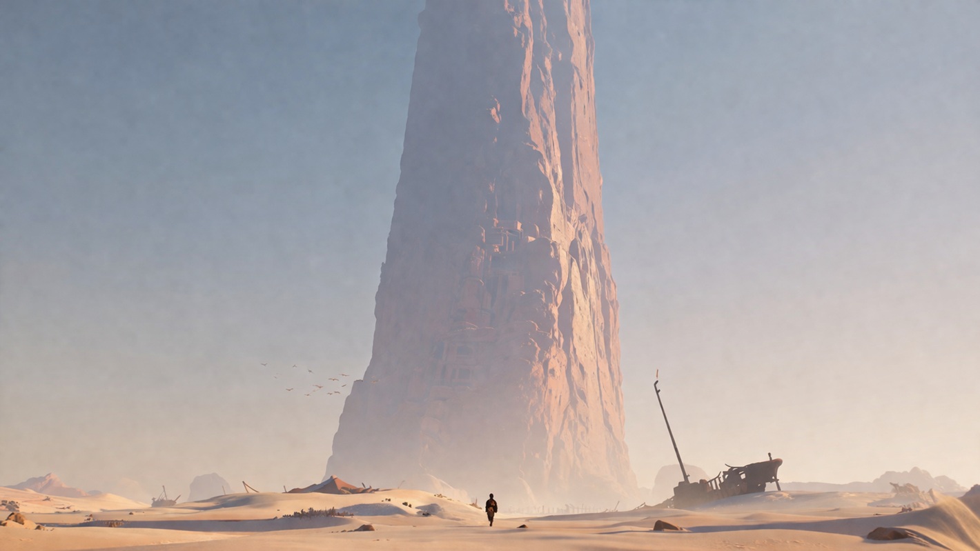 やがて遠くに、天空へと続く巨大な岩の塔が姿を現す。