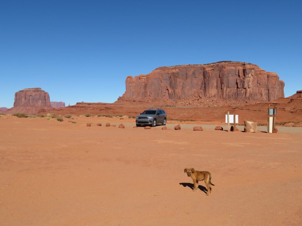澄んだ空と赤い大地、その狭間を歩く犬と停められた車。シンプルで鮮明なコントラストが、異空間のような雰囲気を生み出している。(撮影:筆者)
