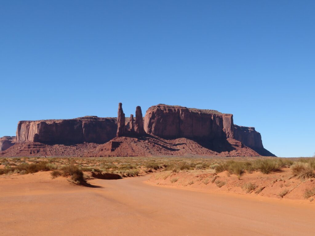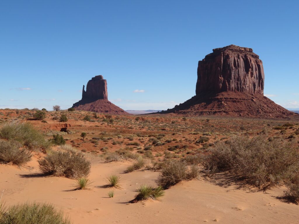 手を掲げるようなイースト・ミトンと、堂々と構えるメリック。モニュメントバレーを代表する二つの巨岩が、赤土の大地に静かにそびえる。(撮影:筆者)