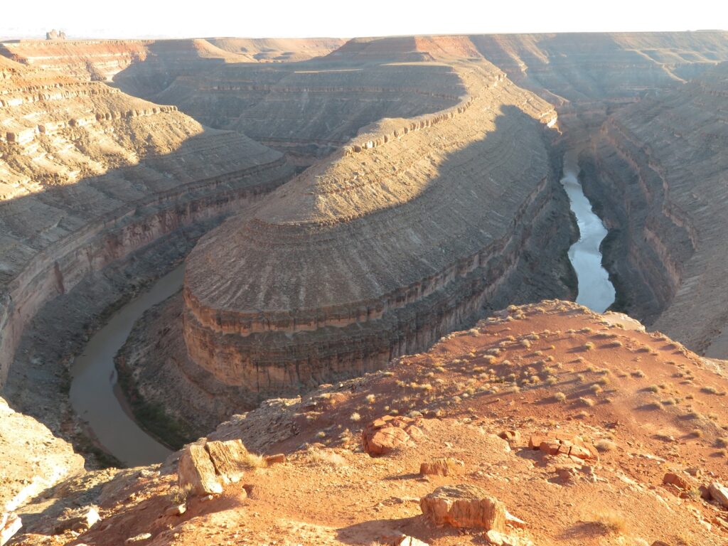 コロラド川支流のサンフアン川が大きく蛇行し、長い年月をかけて刻まれた大渓谷。ユタ州のグースネック州立公園(Goosenecks State Park)からは、川の流れが織りなす壮大な地形を一望できる。(撮影:筆者)