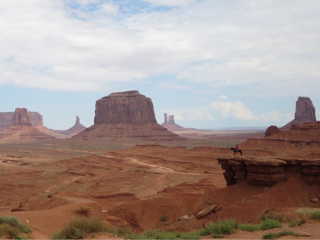 ジョン・フォード・ポイントからの眺め。赤土の断崖に立つ騎馬の姿は、“遥かなる大地”の郷愁を呼び起こす。(撮影:筆者)