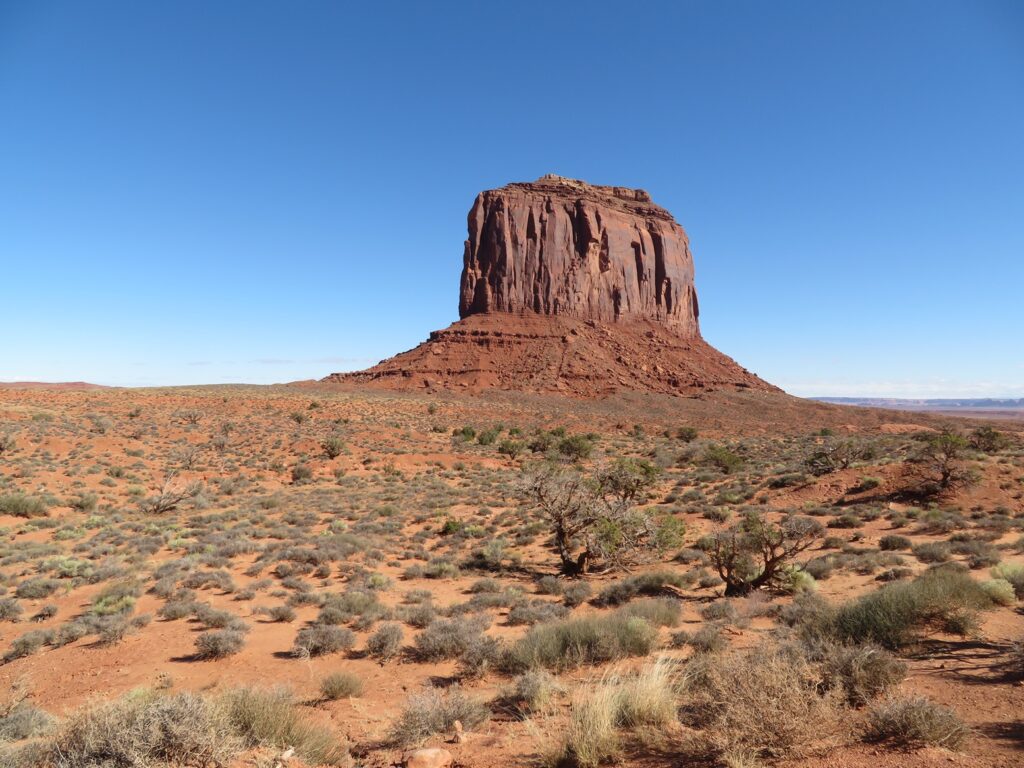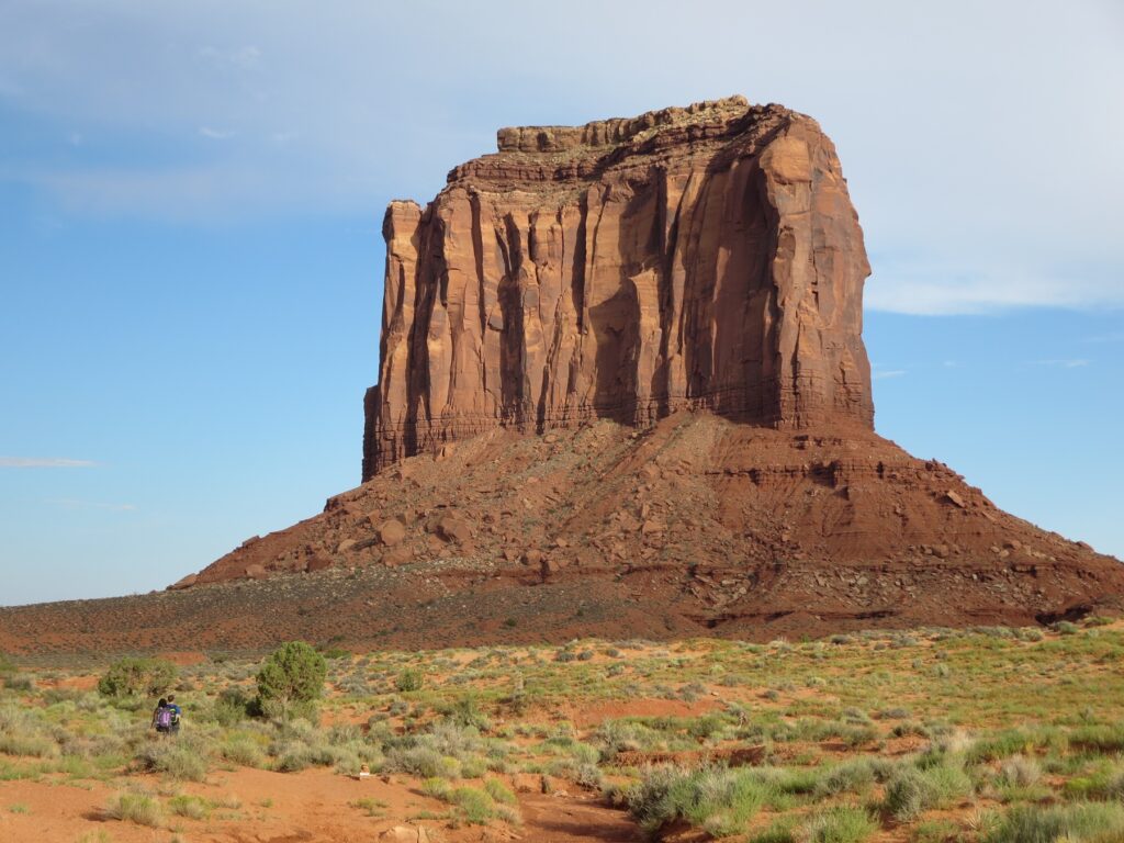 “Merrick Butte”の堂々たる姿。赤茶けた大地に点のように映る左下のハイカーの姿が、その圧倒的なスケールを際立たせている。(撮影:筆者)