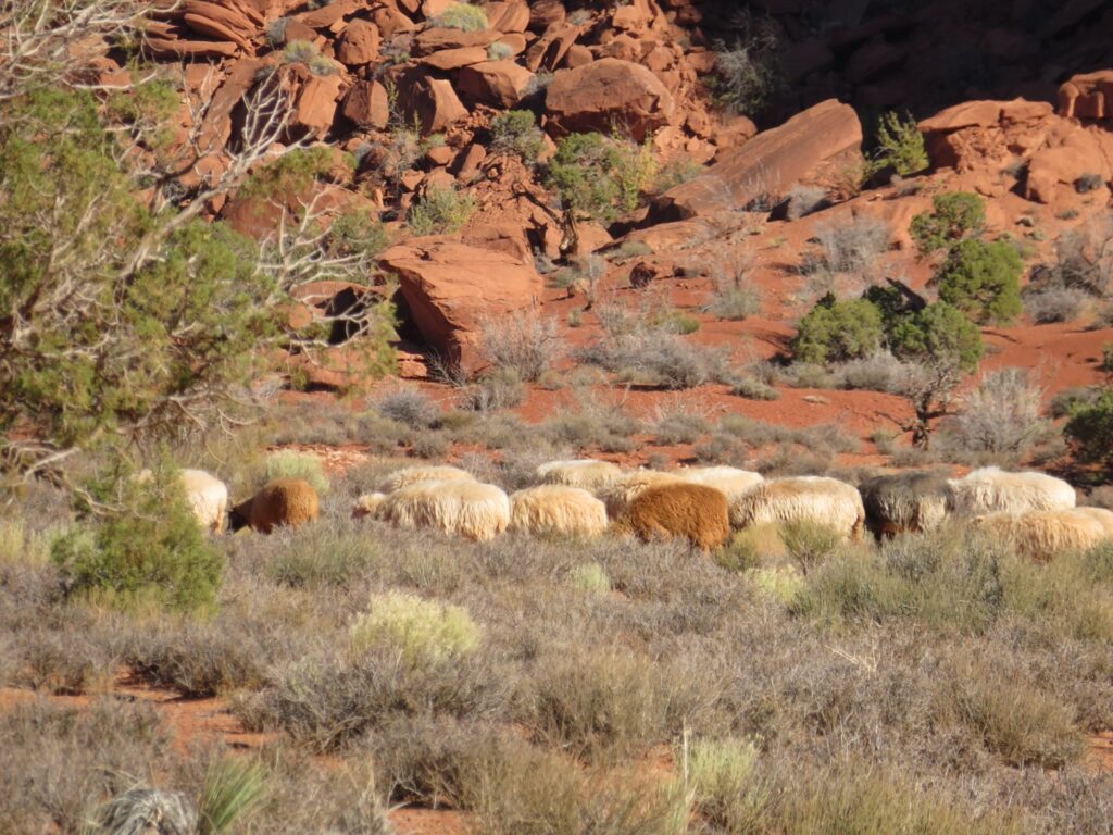 モニュメントバレーの赤土の大地で、羊の群れが草を食む。ナバホの人々の暮らしは、この荒野の中で静かに受け継がれている。(撮影:筆者)