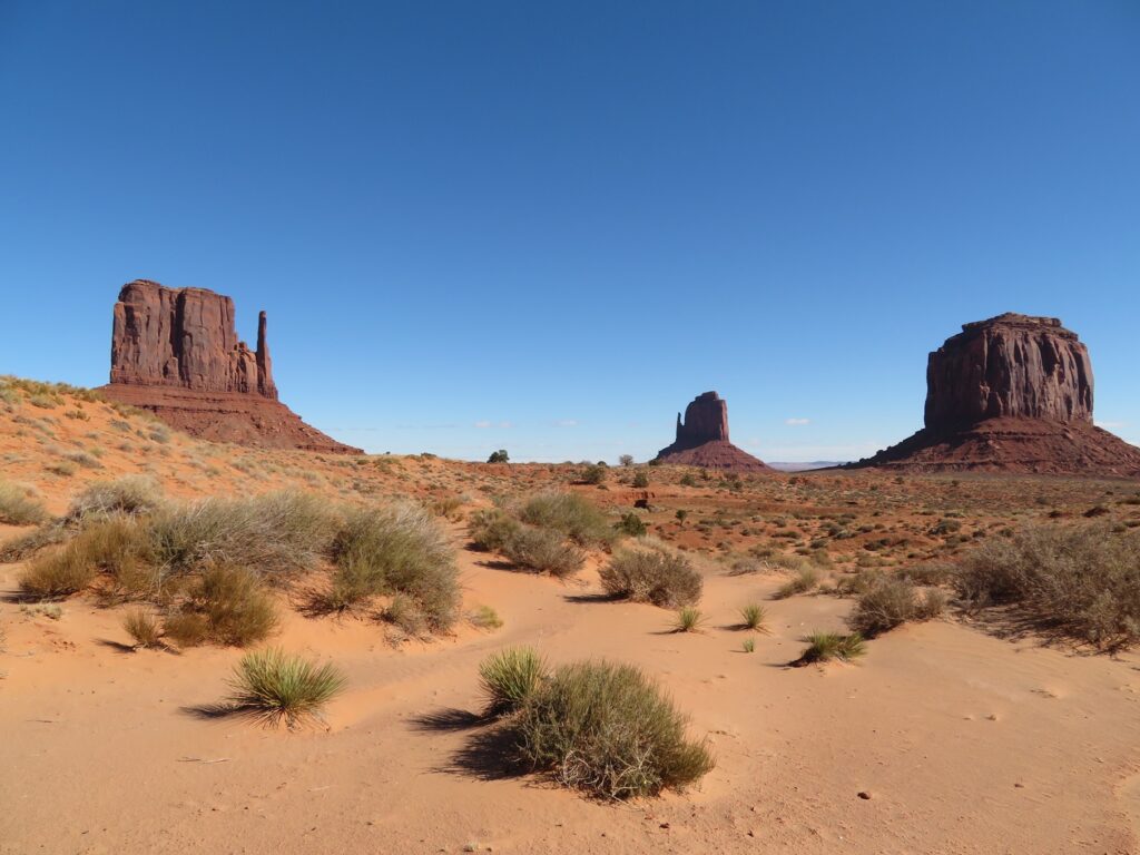 乾いた大地に根を張るユッカやセージ、その先にそびえる三つのビュート。映画や物語の記憶と重なる“西部の色気”が漂う。(撮影:筆者)
