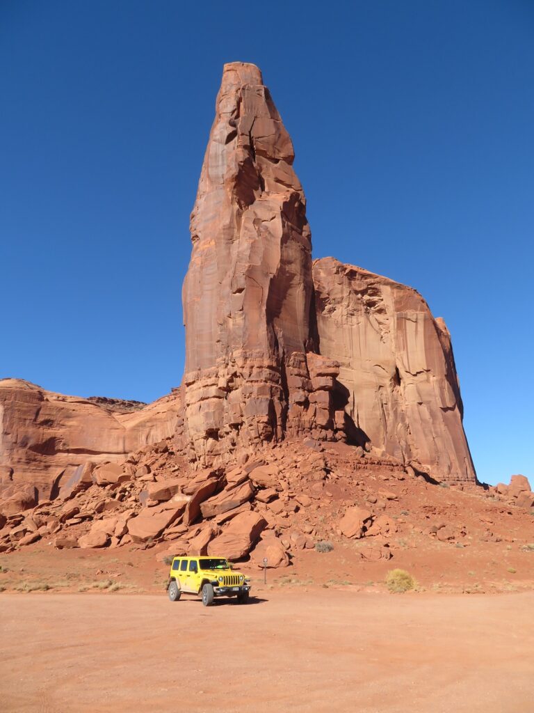 赤土の大地に立つ一本の岩柱と黄色いジープ。車で巡る旅だからこそ、モニュメントバレーの巨大さを肌で感じられる。(撮影:筆者)
