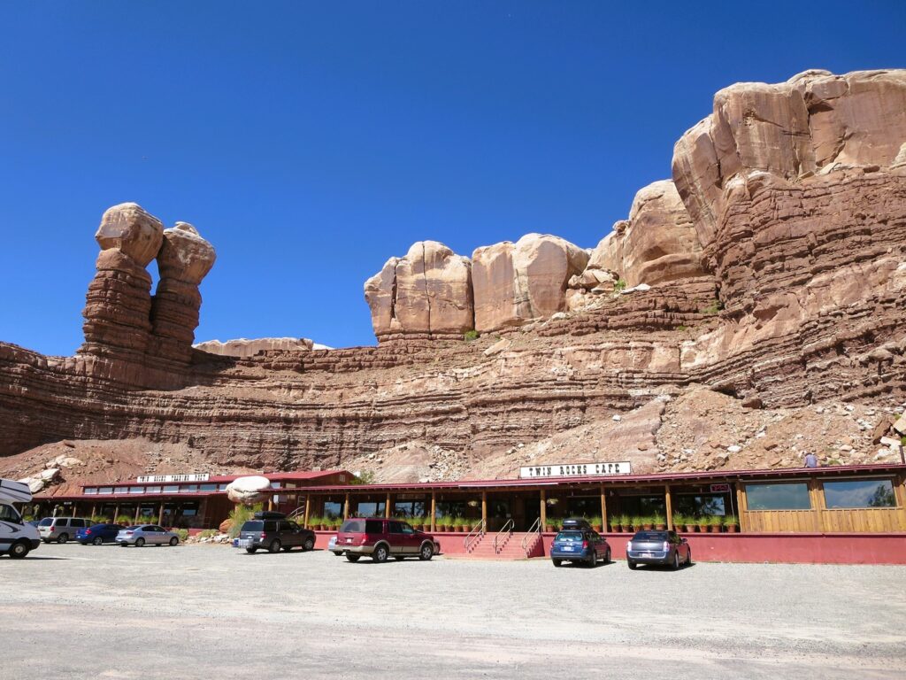 ユタ州ブラフ(Bluff)にある、双子の岩のふもとに建つツイン・ロックス・カフェ(Twin Rocks Cafe)。巨大な岩と並ぶ姿は圧巻!ナバホ族の料理やアメリカンフードを味わえるレストランで、旅行者の休憩スポットとしても人気だ。(撮影:筆者)
