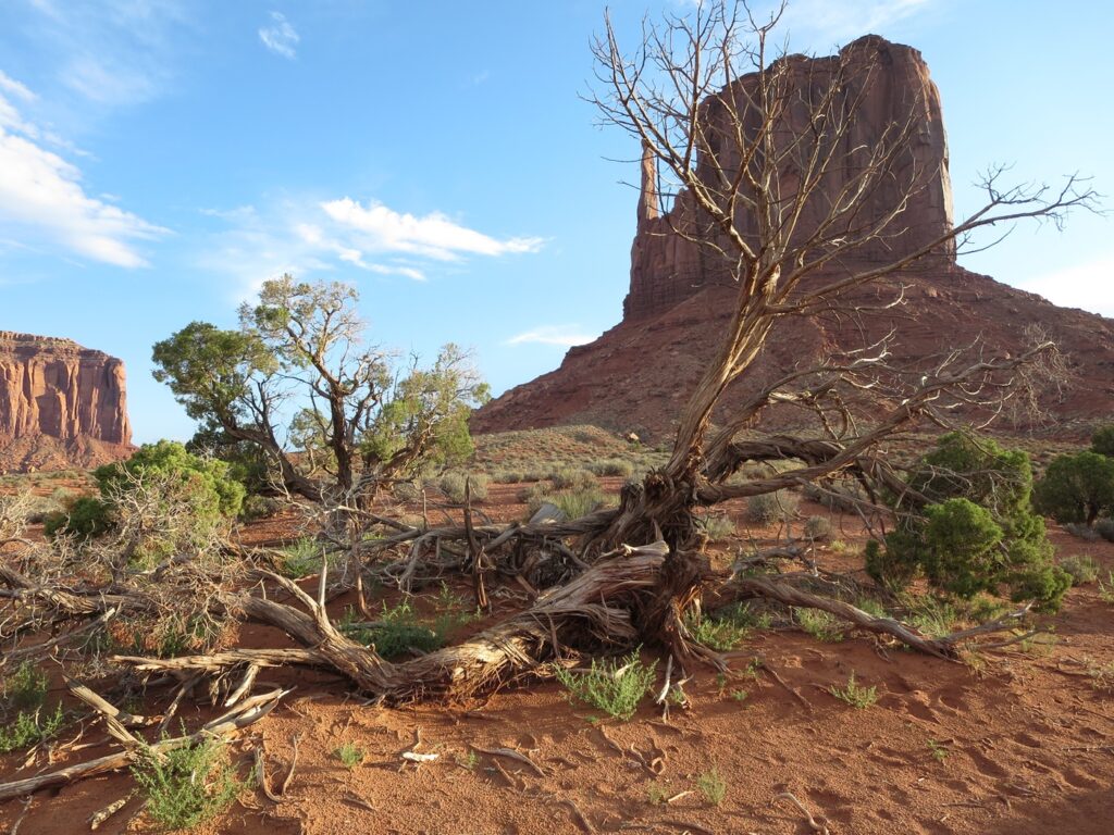 倒木と乾いた樹木のシルエットが、西部の厳しい自然を物語る。静かに立つWest Mitten Butteと響き合い、時の流れを刻んでいる。(撮影:筆者)