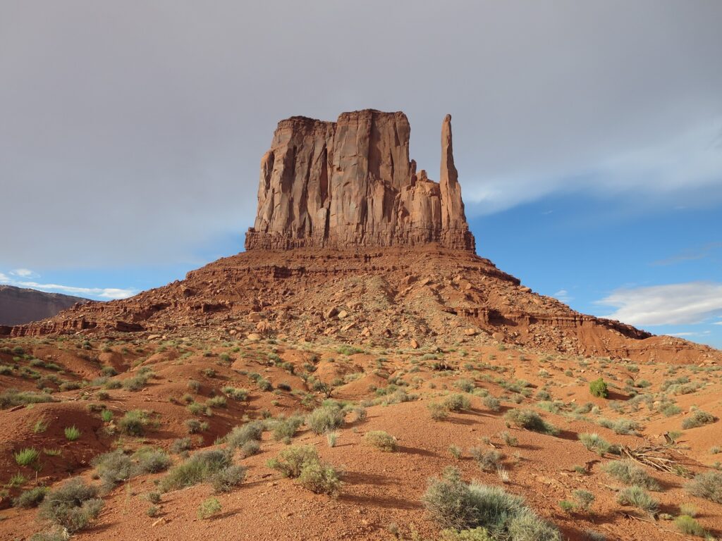 重たい雲に覆われた空の下、赤いビュートが孤高に立つ。雄大でありながら、どこか突き放すような“荒涼の気配”が漂っている。(撮影:筆者)