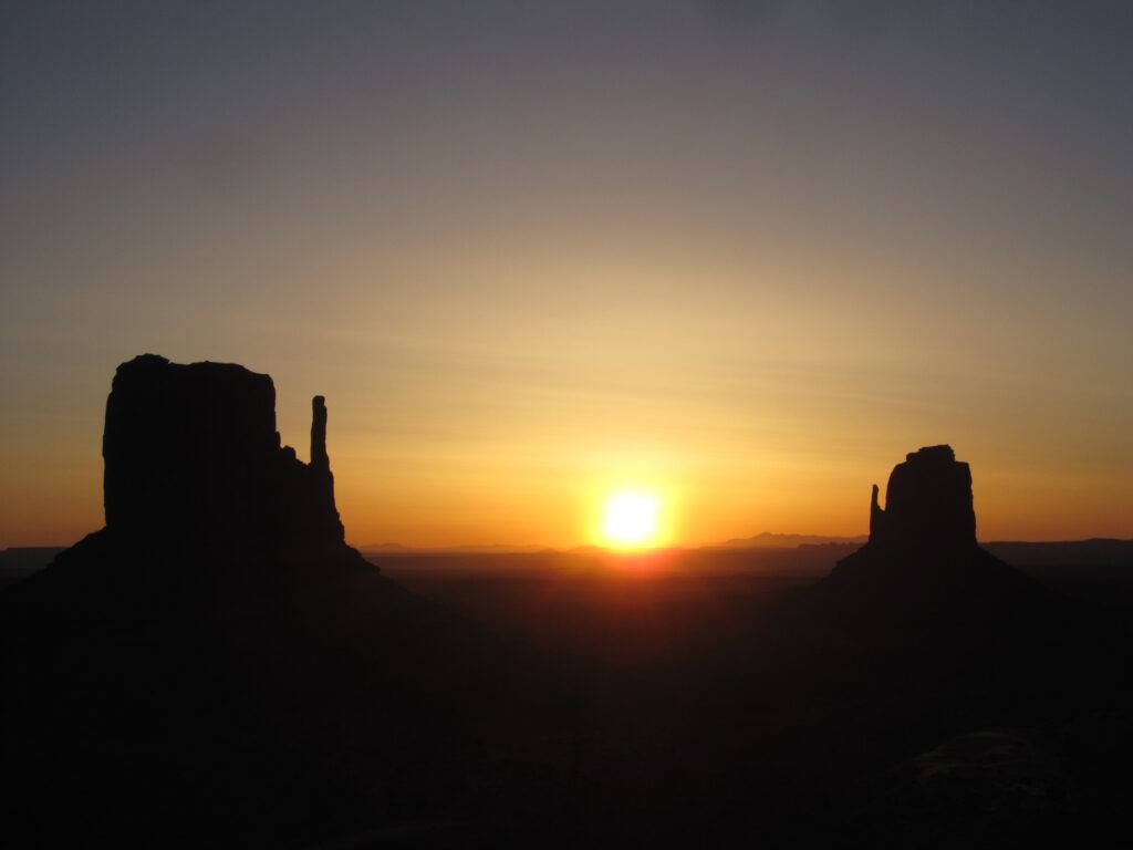 部屋のベランダから迎える夜明け。東の空に昇る朝日が、ミトン・ビュートのシルエットを鮮烈に浮かび上がらせる。(撮影:筆者)