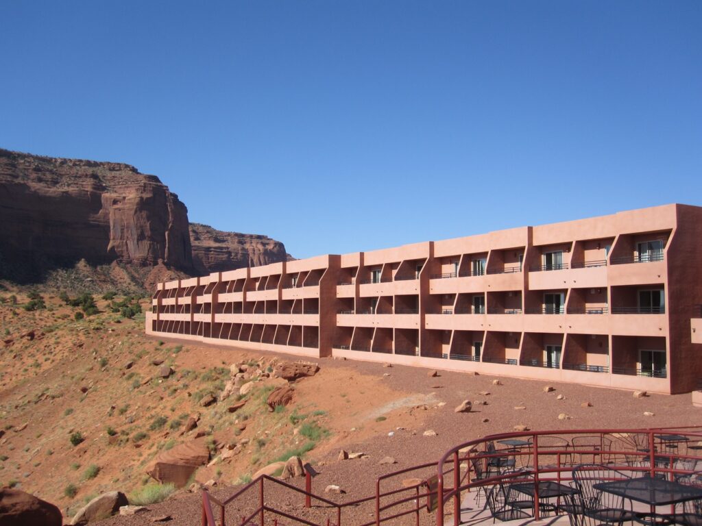 赤土の大地に溶け込む The View Hotel。客室棟は谷に面し、バルコニー越しにモニュメントバレーを望める造りだ。(撮影:筆者)
