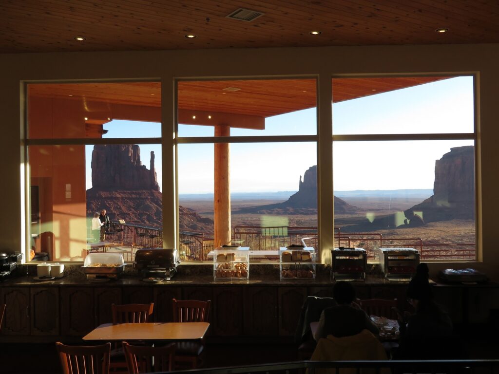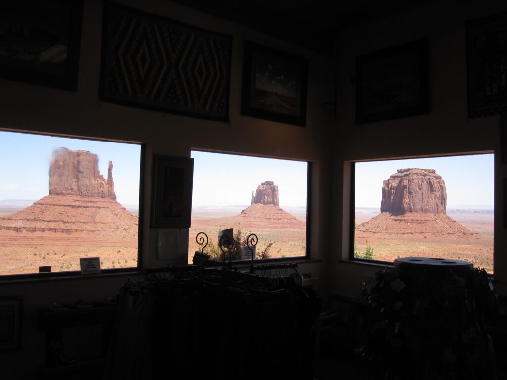 ホテルの売店の窓から広がるビュート群。買い物のひとときさえ、映画のワンシーンのような眺めに包まれる。(撮影:筆者)