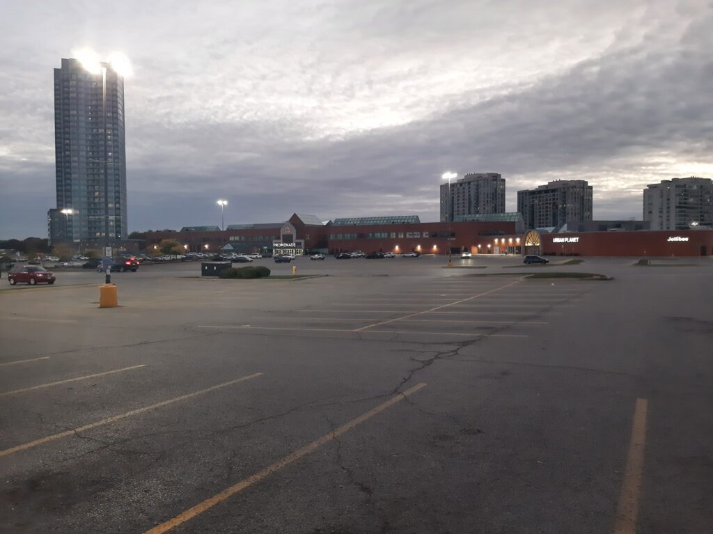 北米郊外のショッピングモール。建物の周りに横たわる広大な余白。(撮影:筆者)